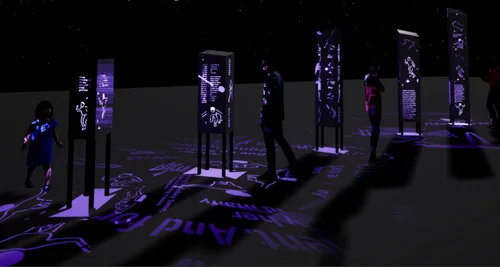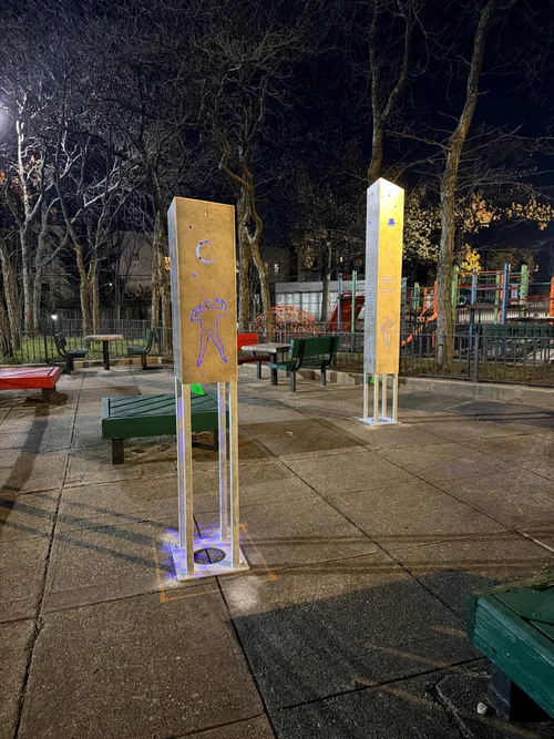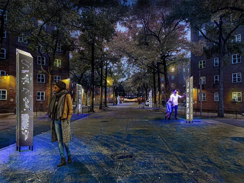 Inspired by Barthé's frieze, multiple migration histories, and Egyptian motifs, the permanent Storywalk installations form a constellation of thirty-five steel artworks distributed throughout the campus, preserving the rich cultural heritage of Kingsborough Houses, the largely African American community. The solar-illuminated forms feature inscribed text and images depicting anecdotal and historical material related to Barthé and Kingsborough Houses, alongside contemporary quotes, movement, and memories from residents in their own voices. Themes include "legends" of Kingsborough, the Great Migration from the United States South, memories of Exodus and Dance ("The Wall"), and the importance of community and extended family.