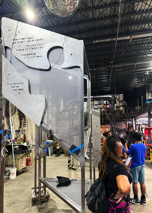 The BuckTown Stitch installation, located at the Brooklyn Navy Yard between Buildings 77 and 92, features an aluminum ribbon weaving through an iron fence. Perforated with imagery and terms representing Brooklyn’s diverse neighborhoods, the ribbon symbolizes interconnectedness and adaptability. Its fluid design contrasts with the strength of the iron fence, illustrating the harmony between progress and tradition. This interplay mirrors Brooklyn’s constant reinvention while celebrating its enduring values of resilience, creativity, and community.